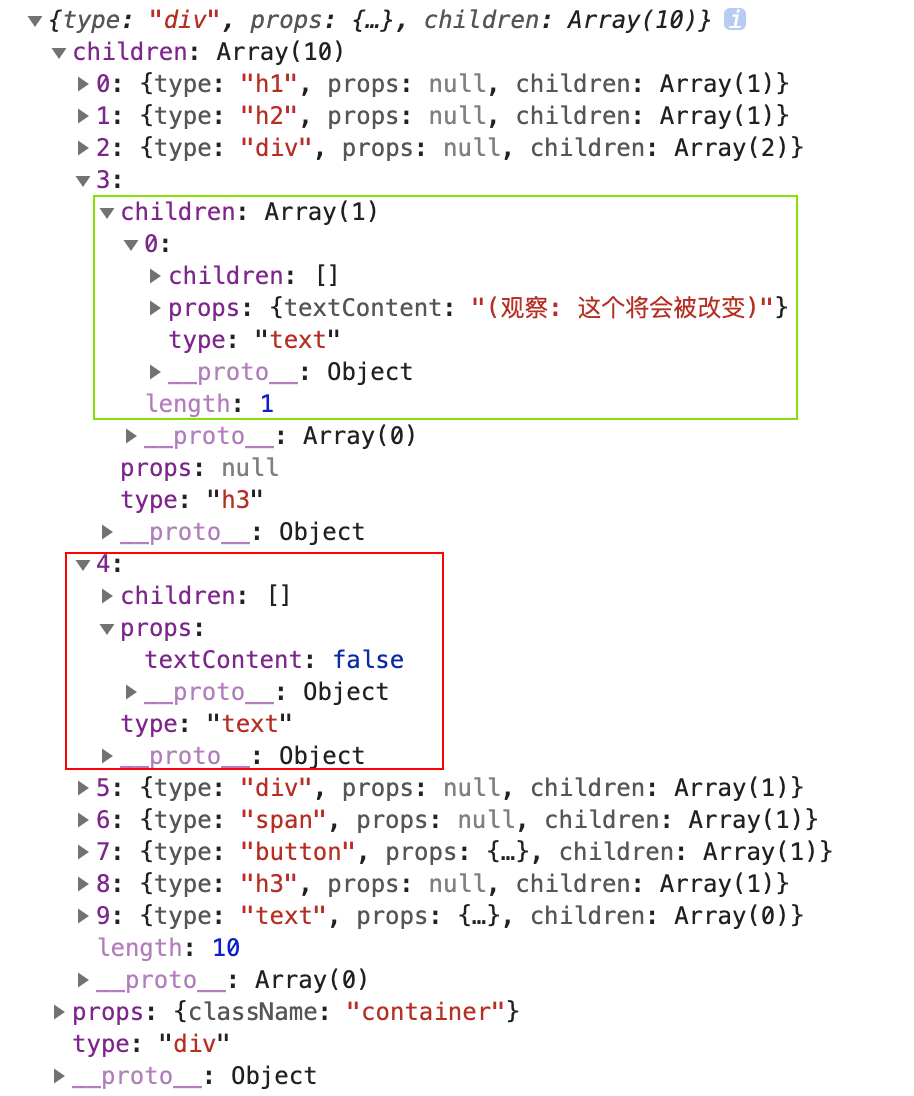 通过观察返回的 Virtual DOM,文本节点已经被转化成了对象类型的 Virtual DOM,但是布尔值也被当做文本节点被转化了,在 JSX 中,如果 Virtual DOM 被转化为了布尔值或者null,是不应该被更新到真实 DOM 中的,所以接下来要做的事情就是清除 Virtual DOM 中的布尔值和null。